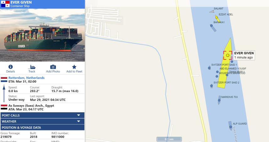 أنفراجة شهدتها أزمة السفينة الجانحة في قناة السويس، بعد استدارتها، مما يمهد لإنتهاء الأازمة المستمرة لمدة أسبوع، وعطلت التجارة العالمية. استمرار محاولات تعويم السفينة الجانحة بقناة السويس لليوم الخامس. فشل محاولة لتعويم السفينة الجانحة وفتح قناة السويس قد يستغرق أسابيع. الفنانة أحلام فيما غرد الفنان راغب علامة :نهنئ أم الدنيا دولة مصر الحبيبة ونهنئ العالم كله بإعادة فتح قناة السويس وتحريك السفينة العالقة. وأعلن رئيس الهيئة بدء مناورات القطر للسفينة الجانحة من خلال ٩ قاطرات عملاقة في مقدمتهم القاطرة بركة ١ والقاطرة عزت عادل وذلك بعد.